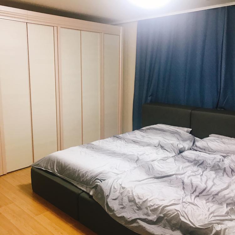 신혼부부 침실이에요~ 이사올때부터 나중을 위해 패밀리침대를 들여놨는데 넓어서 잘때 좋아요. 붙박이장은 아니지만 6단짜리 옷장+이불장은 수납공간이 넓어서 맘에 들어요. 3중방한 암막커튼 덕분에 올겨울 따뜻하게 보냈네요.