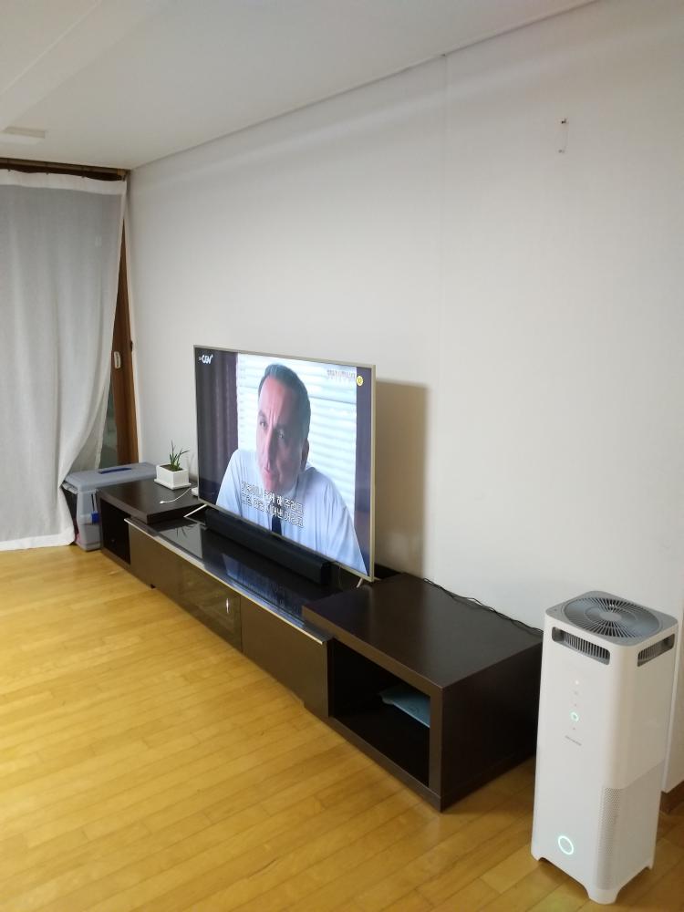 거실에 65인치 UHD TV랑 사운드바 그리고 발뮤다 공기청정기에요. 하이마트에서 샀어요.