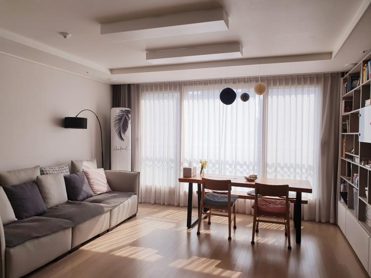 거실에는 6인용 우드슬랩테이블과 전면책장 그리고 쇼파만으로 구성되어있습니다 티비를 잘 안보는 제 성향으로 사진에는 다 나오지 않았지만 전면책장은 직접 디자인해서 제작했습니다