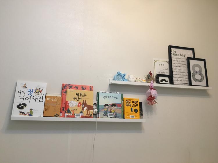 거실 한쪽벽을 선반으로 꾸며봤어요 초등학교 아들이 있어서 손반 하나에는 책을 두었습니다