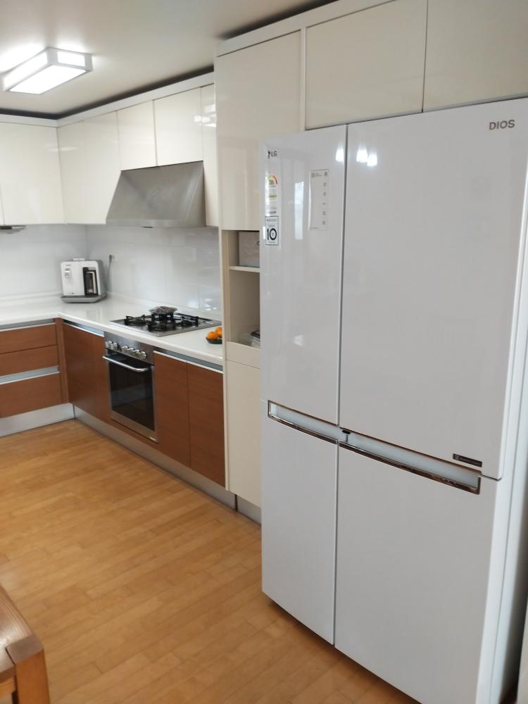 오븐,냉장고,정수기,가스렌지가 있는 주방모습