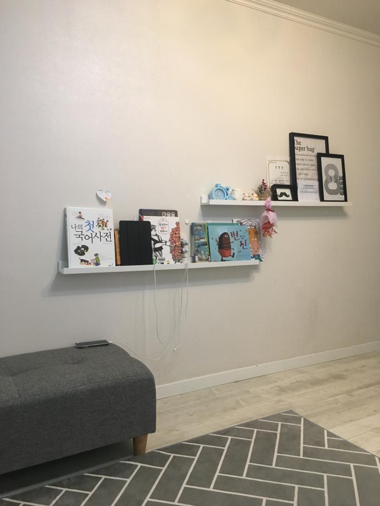 거실 한쪽 벽면에 이케아 선반을 설치해서 액자와 아이책으로 인테리어했어요