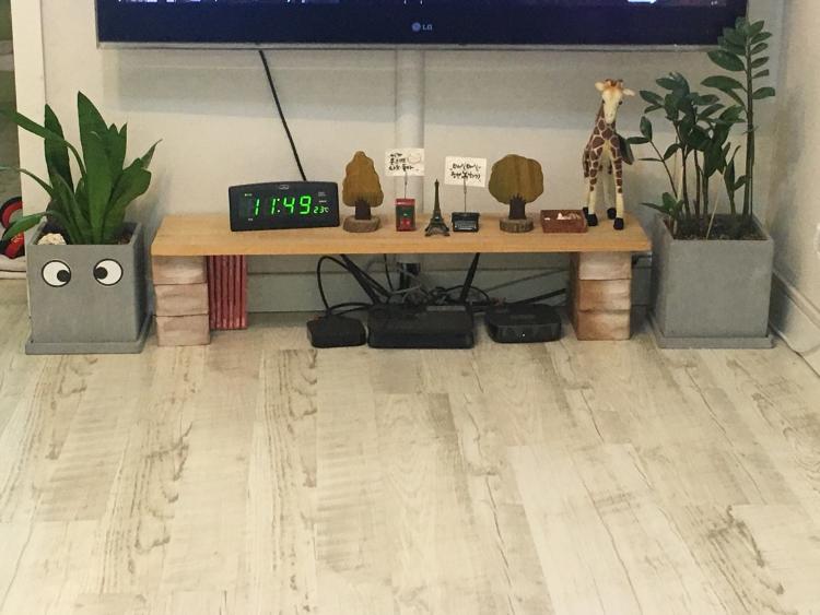 티비밑에 벽돌과 나무선반으로 만들었어요