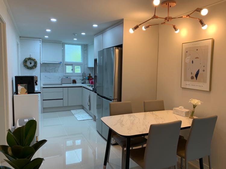 30평대이지만 좁은 주방이라서 밝게 인테리어했어요 :) 골드조명 포인트로 깔끔하게 정리했습니다