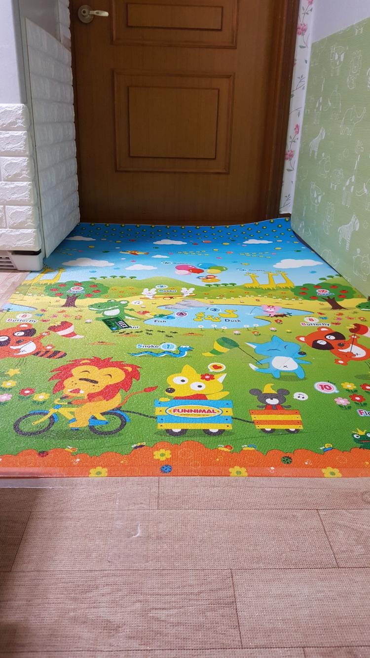 방 두 칸에 넓지 않은 좁고 기다란 복도같은 거실. 가전제품은 없고 가구는 책장 몇 개를 벽에 붙여 놓았는데 그마저도 최근에 버려서 좀 넓어졌어요. 방문 옆으로 빼꼼히 보이는건 동네 하이마트에서 결혼할 때 구입한 클라세 양문형 냉장고인데요, 아이가 걷기 시작하면서 이곳저곳 넘어지고 자꾸 부딪쳐서 냉장고와 같은 컬러의 폼블럭을 붙이고, 벽과 바닥에는 아이를 위한 귀여운 동물패턴의 단열벽지, 단열매트로 꾸며봤어요. 그린컬러의 단열벽지를 붙이니 좁은 공간이 넓게 보이는 착시효과에 대만족 입니다.