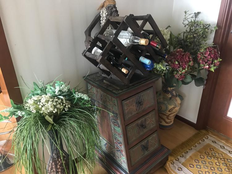 현관에서 거실들어오는 입구에 꾸며놓은 공간입니다. 꽃은 키울 줄 몰라 조화로 꾸며놓았고, 애정애정하는 독특한 와인랙을 배치했습니다~