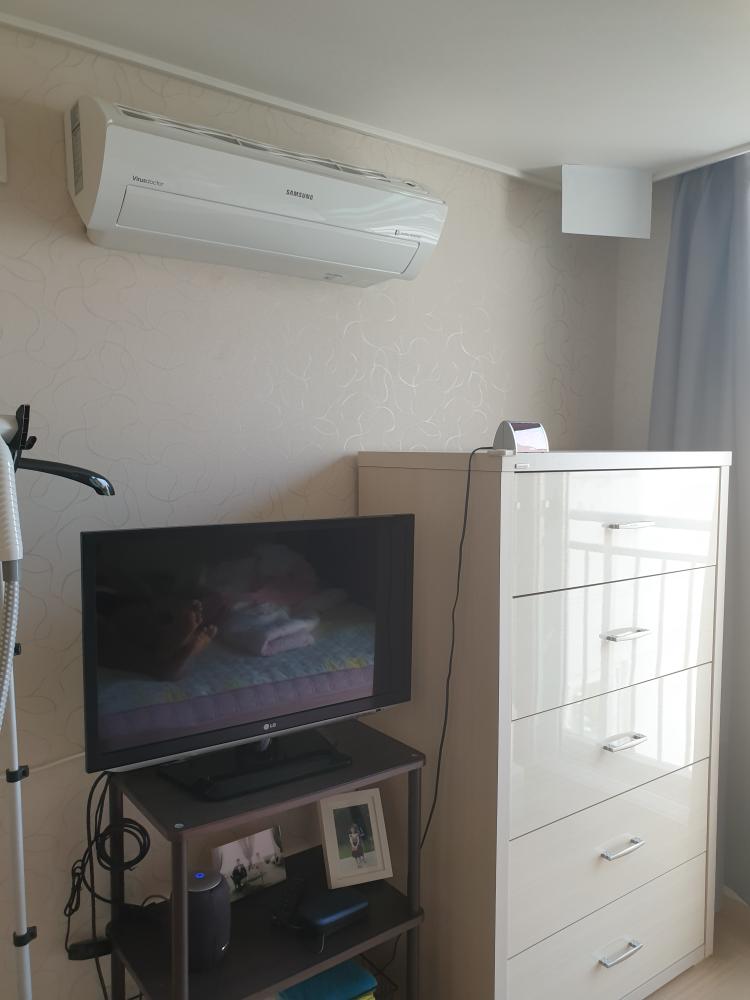 침실에 비치되어 있는 에어컨과 서랍장 3단 선반장 사진입니다^^
