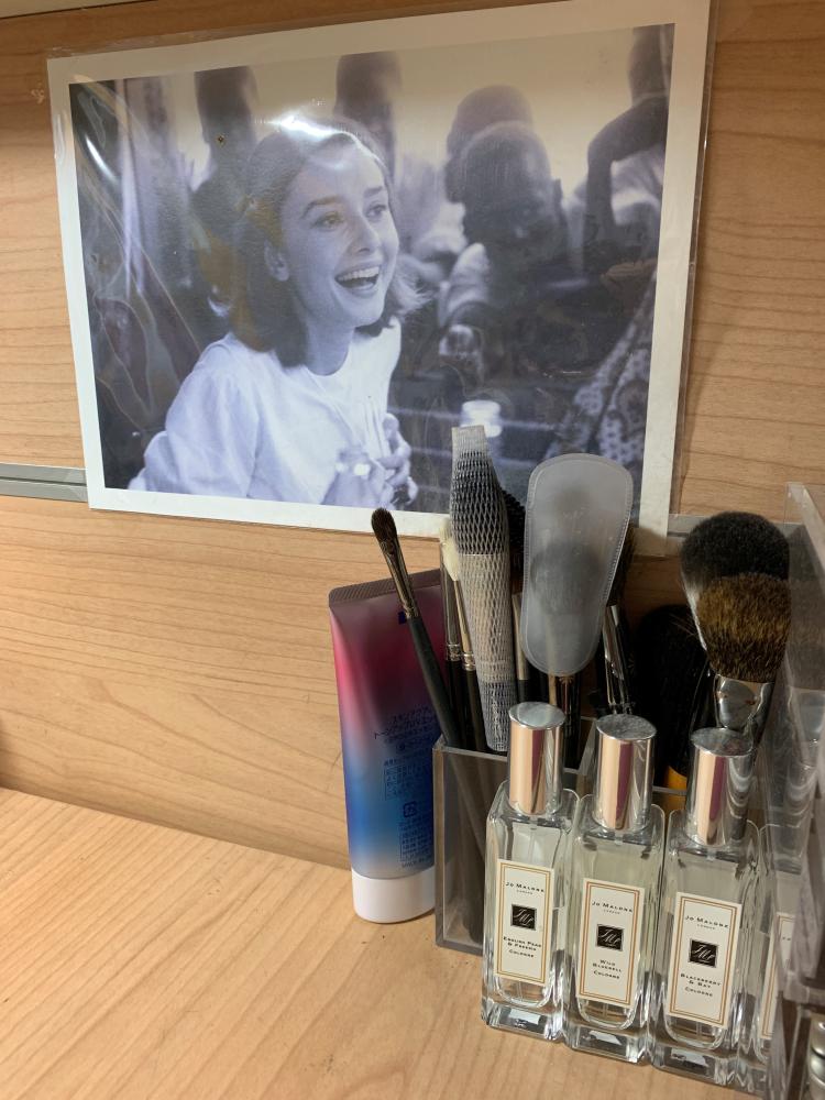 화장을 좋아하는 제 방 한쪽이에요. 선한 영향력이 느껴지는 오드리 헵번 사진이 걸려있어요.