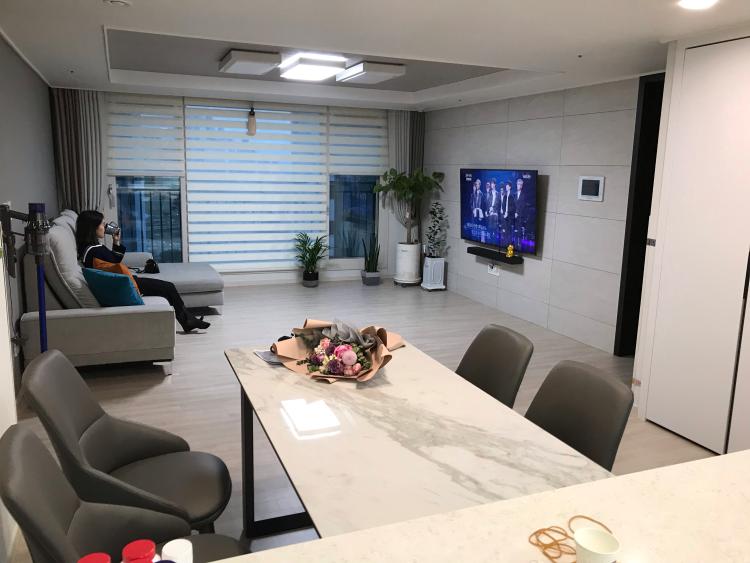 식탁, 쇼파, 블라인드, 커튼 까지 모두 그레이로 색맞춤 했어요