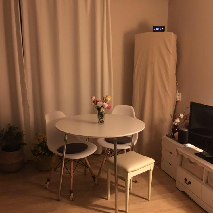 제가 애정하는 저희 집의 거실이예요! 테이블엔 종종 꽃시장에서 사온 생화를 올려두어 꾸미곤해요