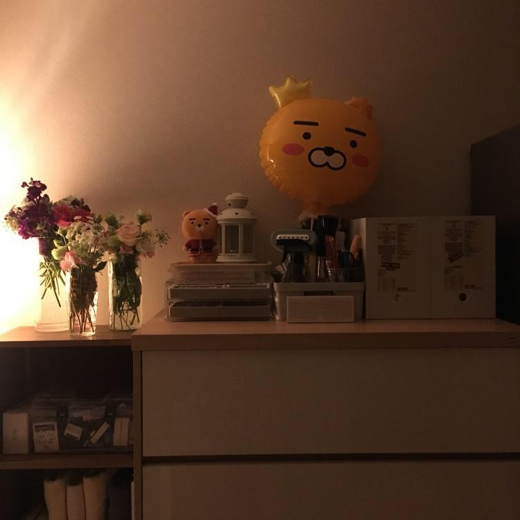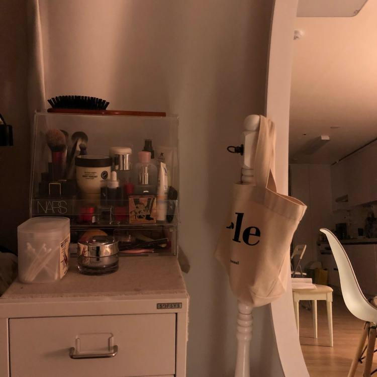 여긴 제 화장대 공간이예요~ 화장대를 놓을 공간은 없어서 행거 옆에 철제서랍장과 아크릴 화장대를 두고 쓰고있어요