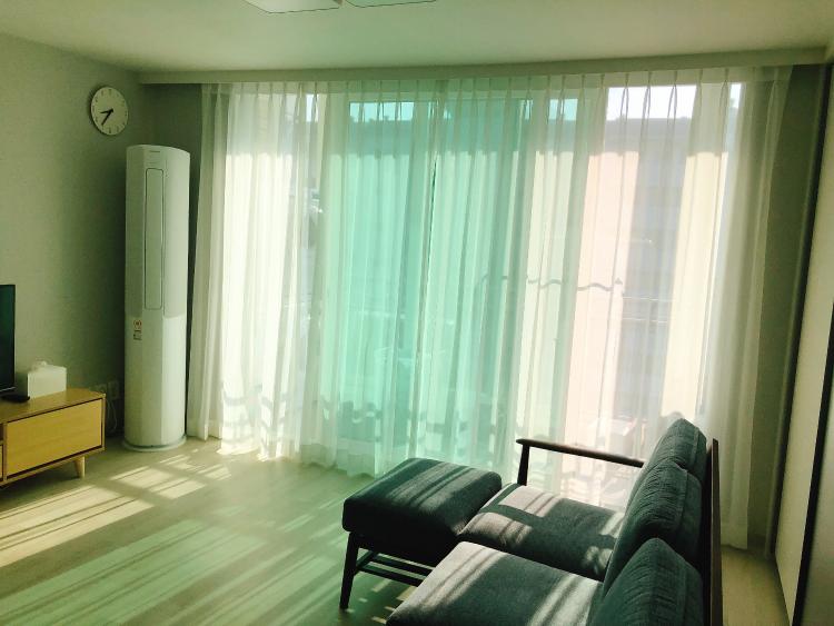 쉬폰 커튼 설치로 더 환해보이는 거실입니다