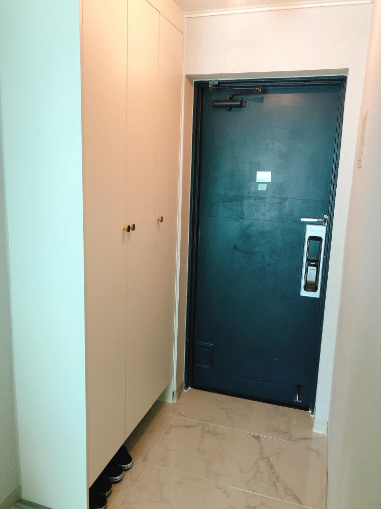 무광 화이트 신발장과 무광 골드 손잡이, 그리고 유광 마블타일로 재탄생한 현관입니다
