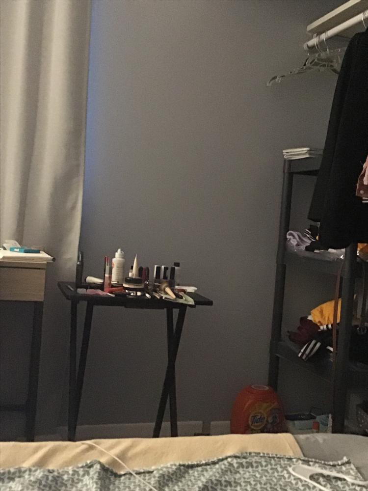 혼자 쓰는 침실 간단하게 미니 데스크에 화장품을, 옆의 선반에는 여름 옷들을 정리해 뒀어요