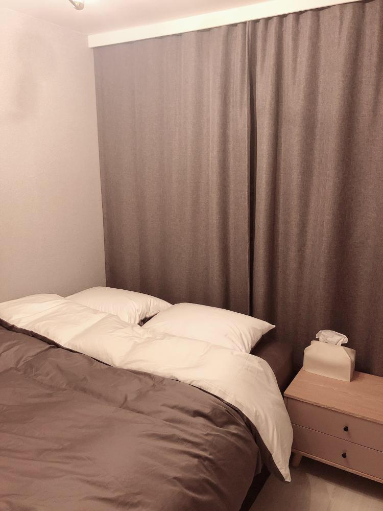 암막커튼과 어두운 색 벽지와 침구로 아늑한 침실입니다