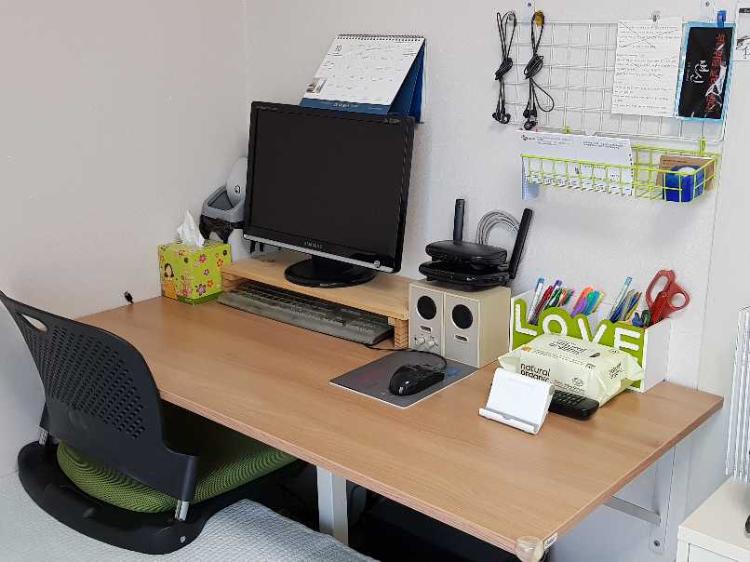 좁은 집을 최대한 활용하기 위해 거실에 소파 대신 슈퍼싱글 수납침대를 놓고 책상 다리를 떼서 벽에 고정시켜 침대 위에 좌식의자를 놓고 사용하고 있어요~