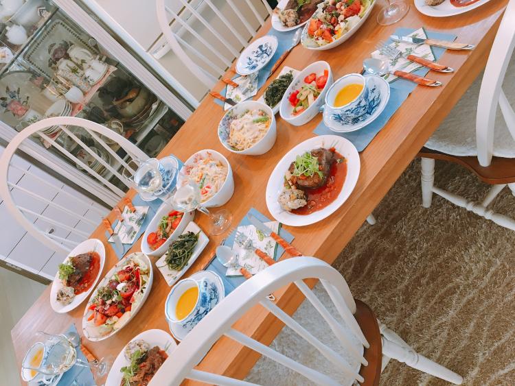 가족끼리 집에서 함께 한 홈메이드 요리 파티입니다. 종이 냅킨을 겹쳐서 데코레이션을 하고 통일감 있는 식기에 음식을 담았습니다. :)