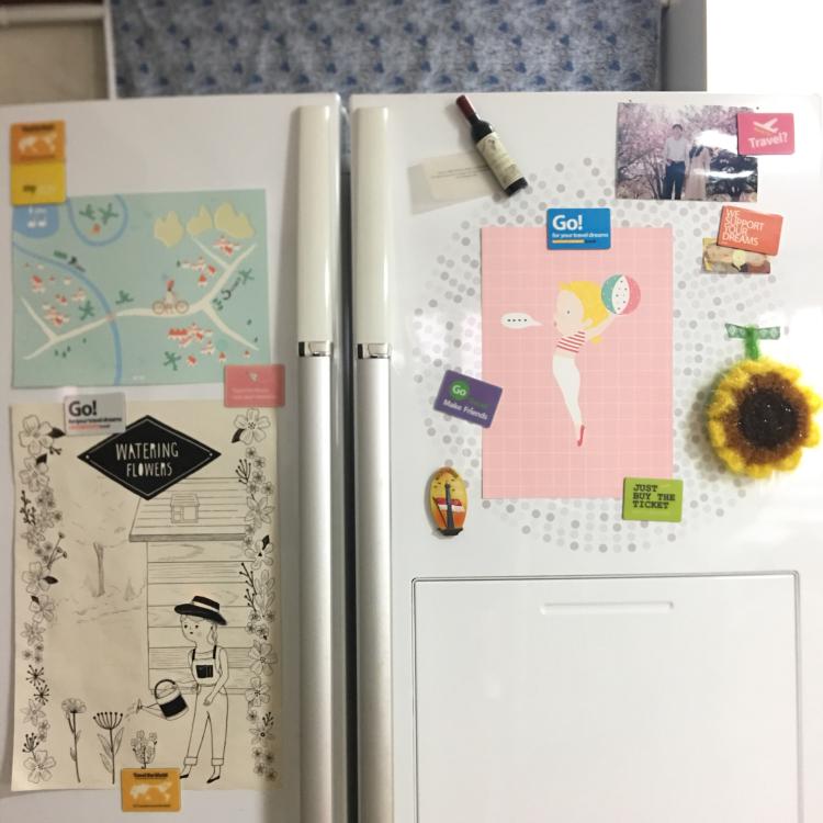양문형 냉장고에 신혼의 알콩달콩을 표현해봤어요. 냉장고에 붙은 콘텐츠들은 평소에 예쁘다고 생각했던 것들을 조화롭게 붙였습니다! 신혼 사진도 붙이고 오른쪽에 해바라기 수세미도 붙여놨어요. 냉장고 자석만 구매해봤어요!
