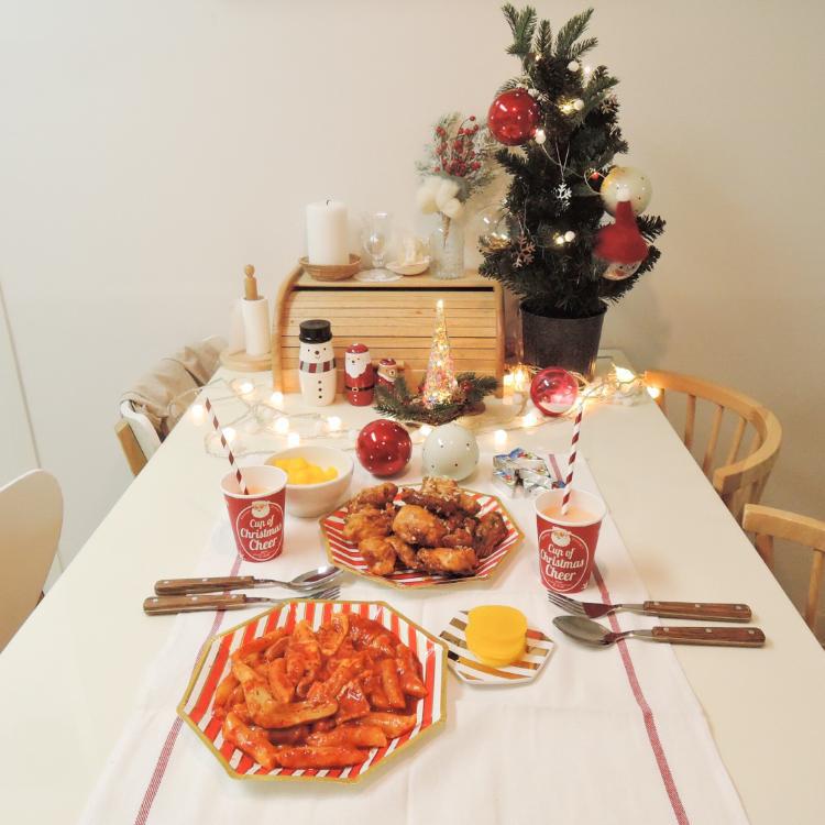 주말엔 남편이랑 이렇게 크리스마스 파티 테이블도 소소하게 차렸답니다. 떡볶이랑 치킨을 주문해 화려한 파티용 접시에 담아주고 조명도 켜두니 나름대로 완전 크리스마스 파티 분위기죠? :) 연말까지 더더욱 크리스마스 분위기 느끼고 싶네요~!