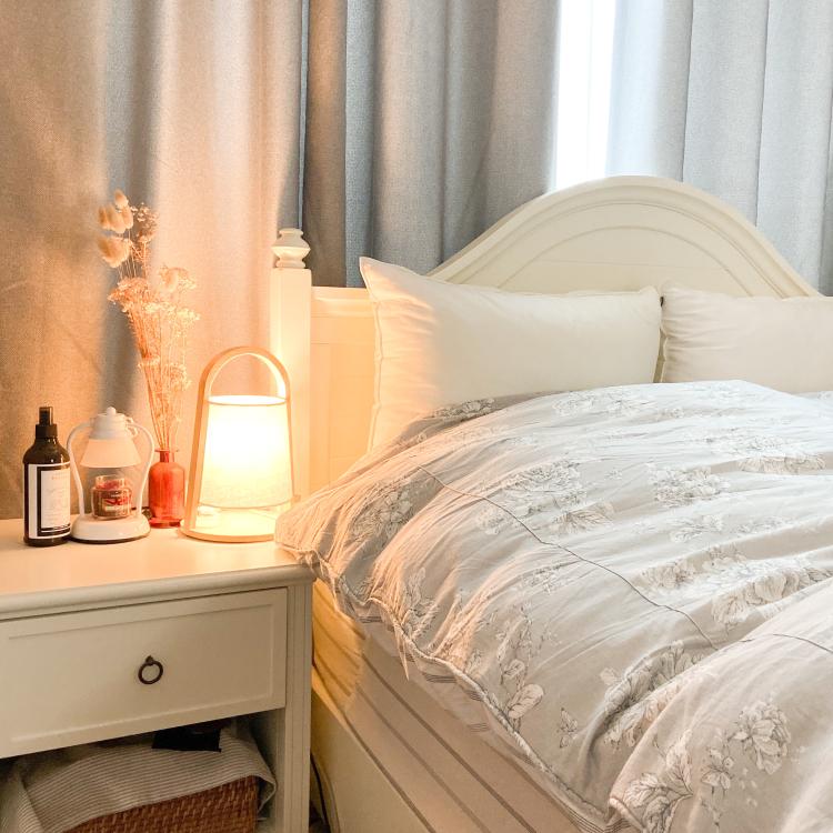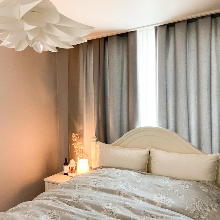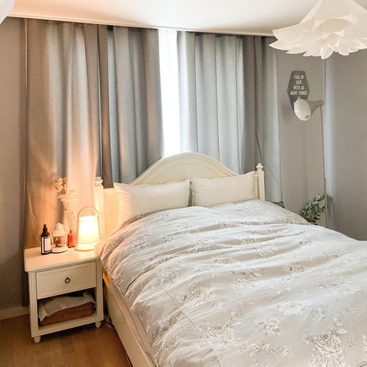 침구랑 벽지, 커튼을 모두 모노톤으로 맞춰 차분한 분위기로 만들었어요.