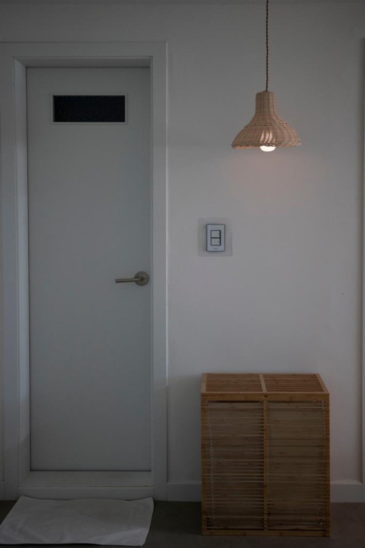 욕실앞 햄퍼와 라탄 조명이 잘어울리는거 같아요~