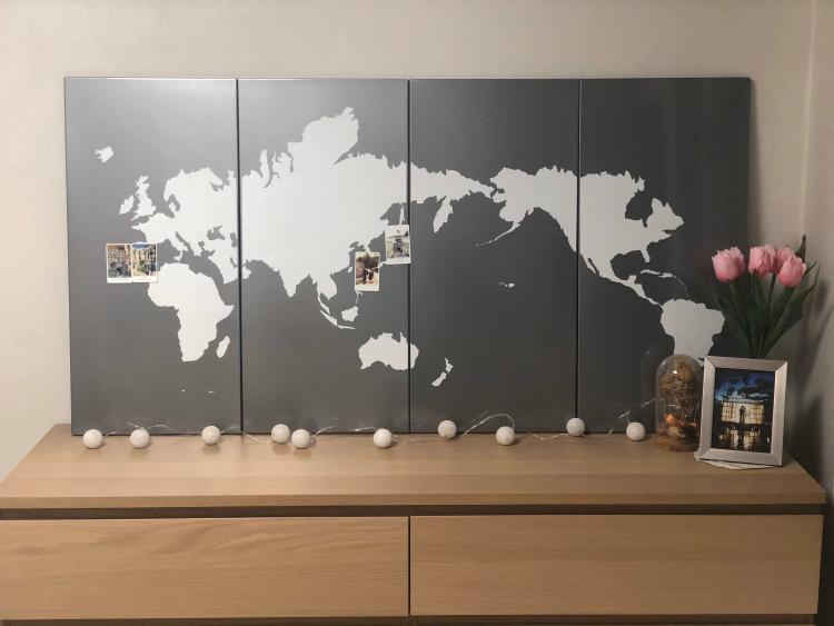 저희가 여행다녀온 곳의 사진으로 꾸미고싶어 이케아에서 산 마그네틱판에 세계지도 따라 직접 그리고 붙인 세계지도입니다. 앞으로 다양한 나라 여행다녀오고, 세계지도에 사진을 가득 채우는게 저희 부부 꿈이예요!