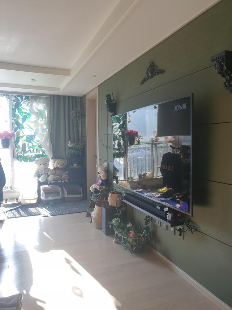 편안함을주는 톤다운된 그린색 거실입니다..