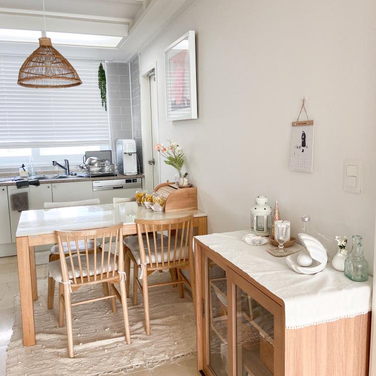 원목과 베이지컬러, 라탄 소재를 좋아해 편안하게 꾸민 주방이에요.