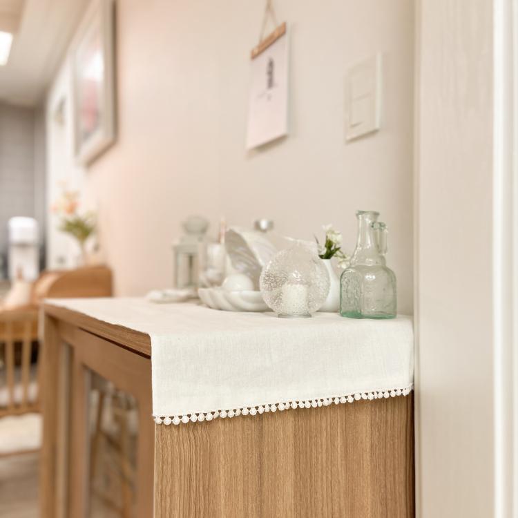 그릇장 위에 천을 깔고 소품들을 올려두었어요. 요즘 가장 자주 손 많이 가는 장소에요.ㅎㅎ