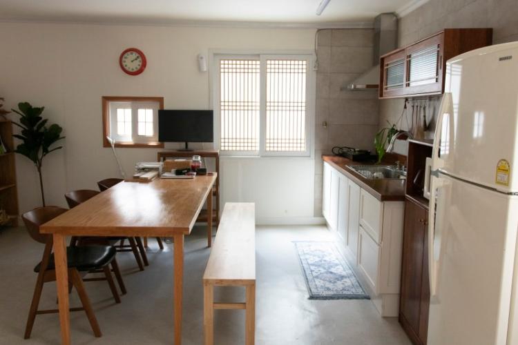 거실겸 주방이 있는 옛날 단독주택입니다. 일자형 싱크대와 큰 테이블을 두어 사무실로 쓰는데 식사도 하고 공부도 하고 쉬기도 해요.