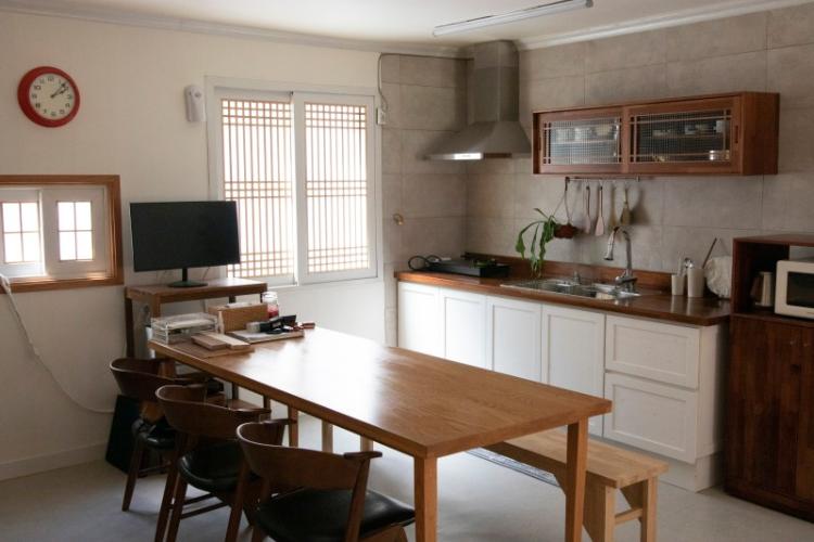 거실겸 주방이 있는 옛날 단독주택입니다. 일자형 싱크대와 큰 테이블을 두어 오피스로 쓰는데 식사도 하고 공부도 하고 쉬기도 해요. 레트로하게 꾸몄습니다.
