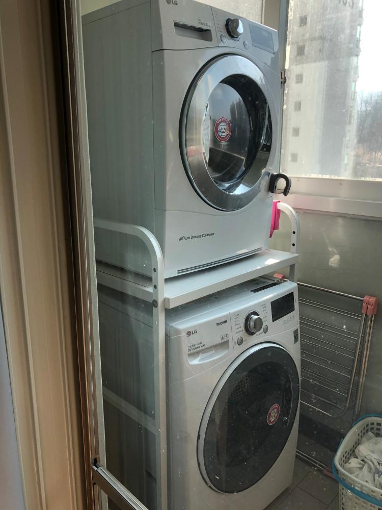 17평 아파트라 안방 베란다에 세탁기를 놔야해요. 옛날식 아파트라 베란다가 넓어 거치대 설치해도 여유작작인 점이 좋습니다.