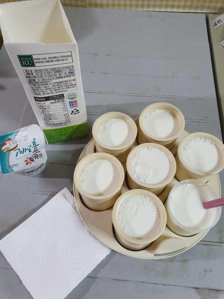 집에서 요거트 제조해서 먹어요. 플레인요거트한통, 우유(저지방 이런거 안됨, 원유만) 섞어서 제조기에 넣고 8시간 뒤 완성.
