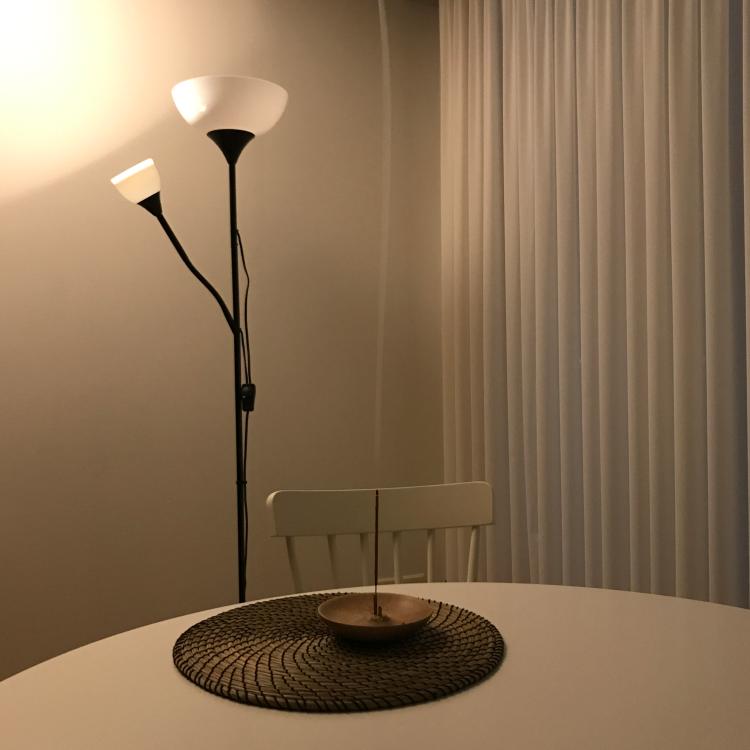 이케아에서 구입한 원형테이블과 깔맞춤 의자, 플로어 조명이구요, 쉬폰커튼 잘 비치지 않는 것으로 직접 달았어요. 나그참파를 자주 피워놓아요. ㅎㅎ