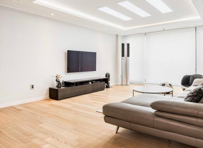 깔끔하게 정돈된 거실로 벽걸이 티비가 넓어보이네요.