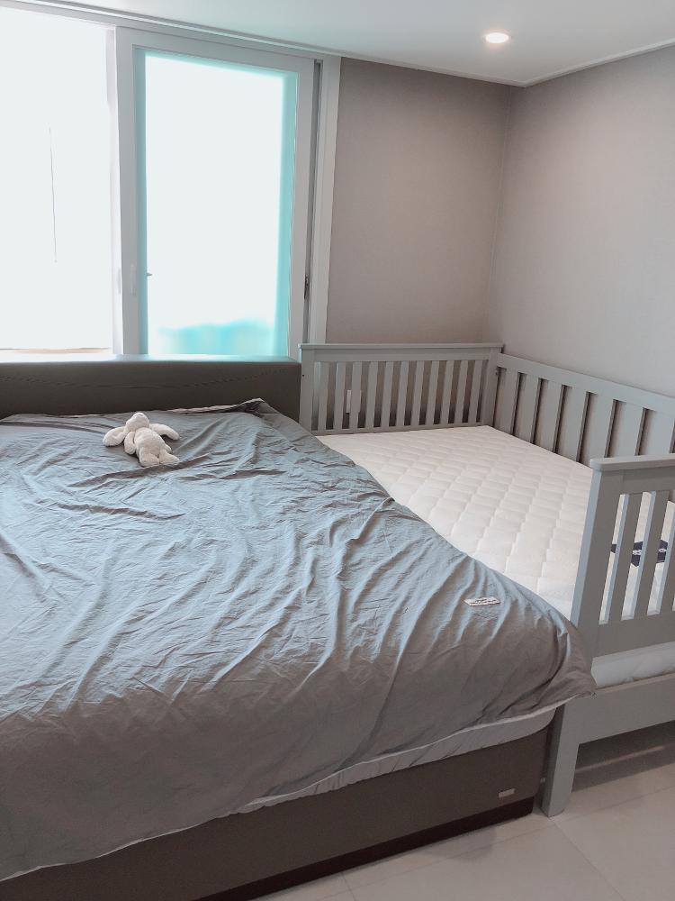 저희집 침실이에요! 아기침대와 연결해서.패밀리 침대로 사용하고 있는데 넓어서 넘 좋아요