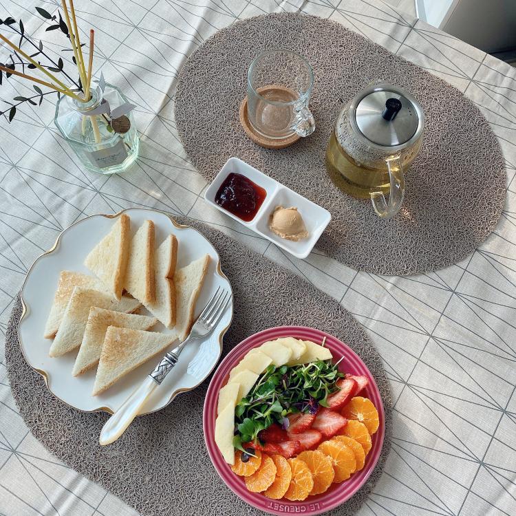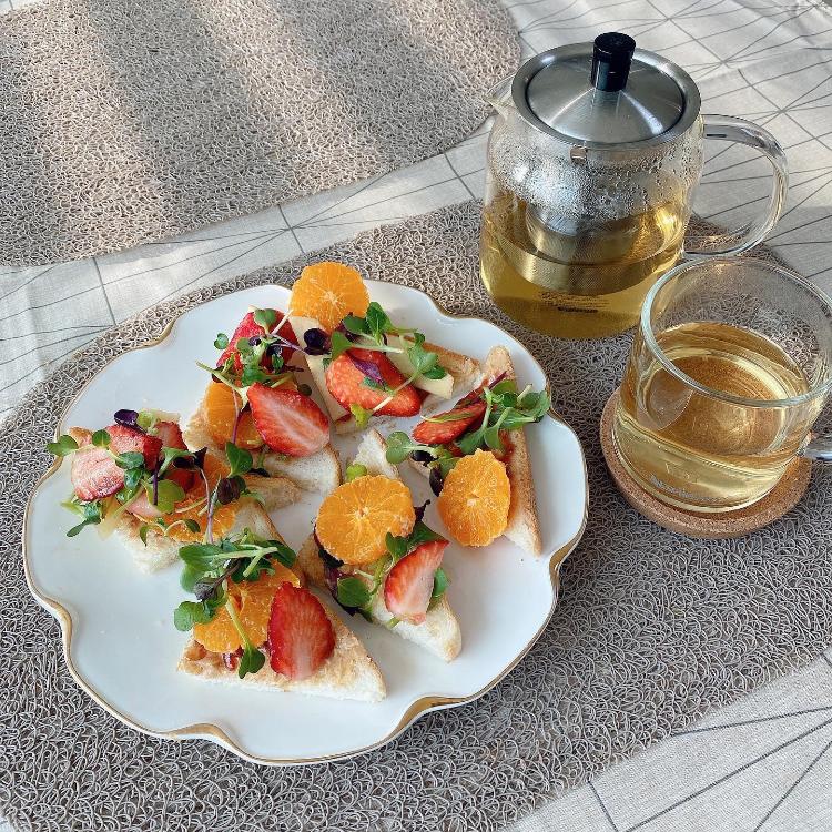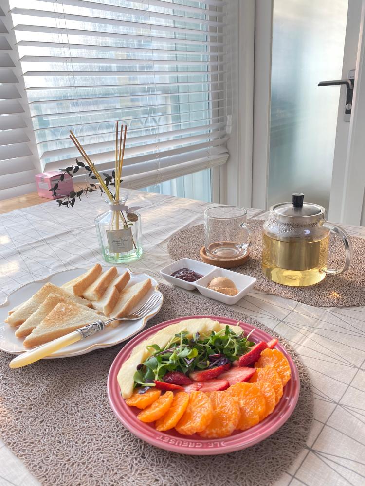 따뜻한 녹차가 오전커피 대신으로도 좋았어요. 과일 샐러드로 꽃꽂이 하는 기분이네요 . 눈으로도 기분좋게 식사했어요