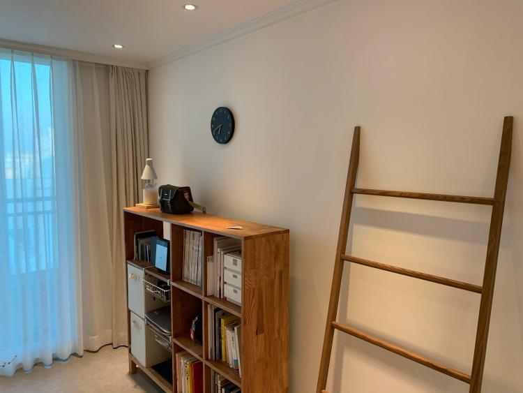 책장 옆에 사다리를 두어서 담요나 식물을 걸어두고 있어요