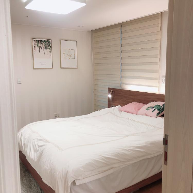 침실은 숙면을 잘 취할 수 있도록 아늑한 분위기을 연출하고 싶었어요. 그래서 우드브라운의 차분한 침대를 선택하였답니다.