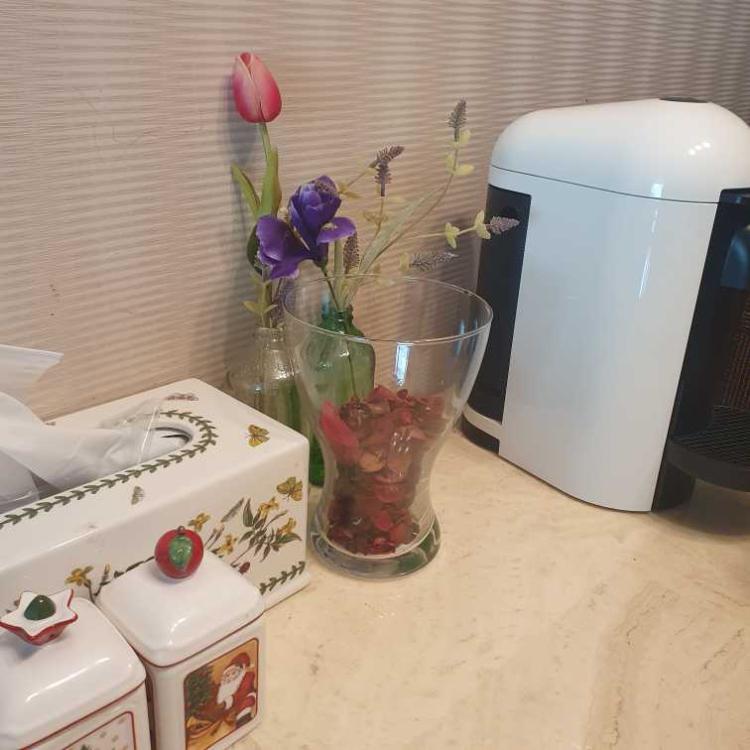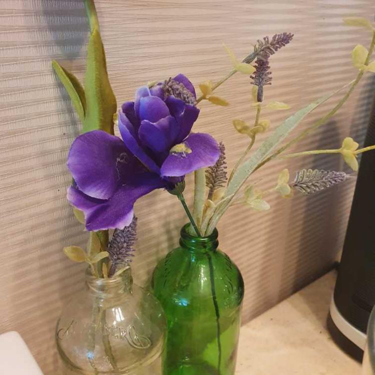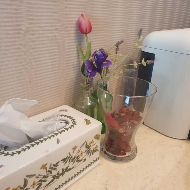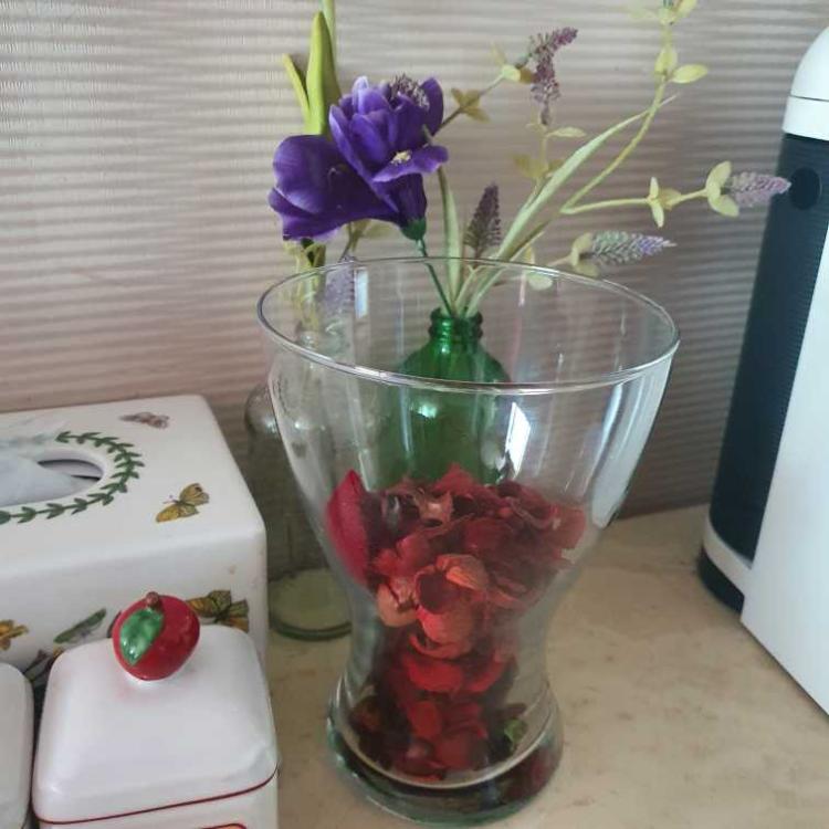 식탁위 포푸리와 재활용된 병에 조화를 꽂아