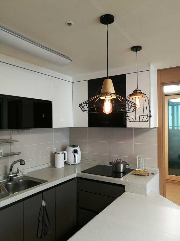 입주 그대로의 주방...조명만 교체해서 새로 달았어요!! 원목 조명이 정말 예뻐요