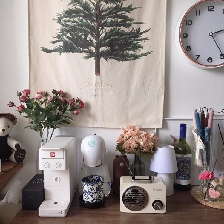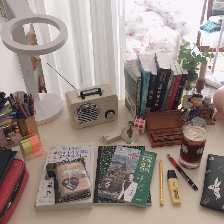 아날로그 감성 듬뿍 들어간 라디오 겸 블루투스 가능한 스피커예요 ㅎㅎ 책상이랑 딱 잘 어울리는 거 같아요 !
