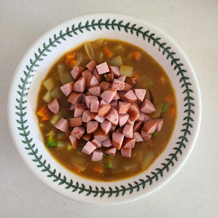 카레에 소고기 안 넣고 햄을 썰어 넣었어요,,