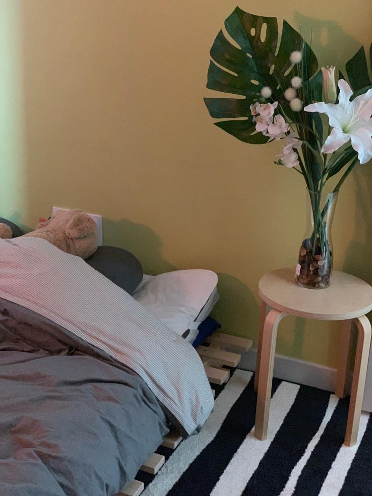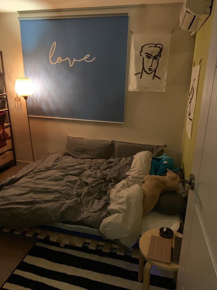 따뜻하고 포근한 느낌의 벽지와 낮은 침대에요.