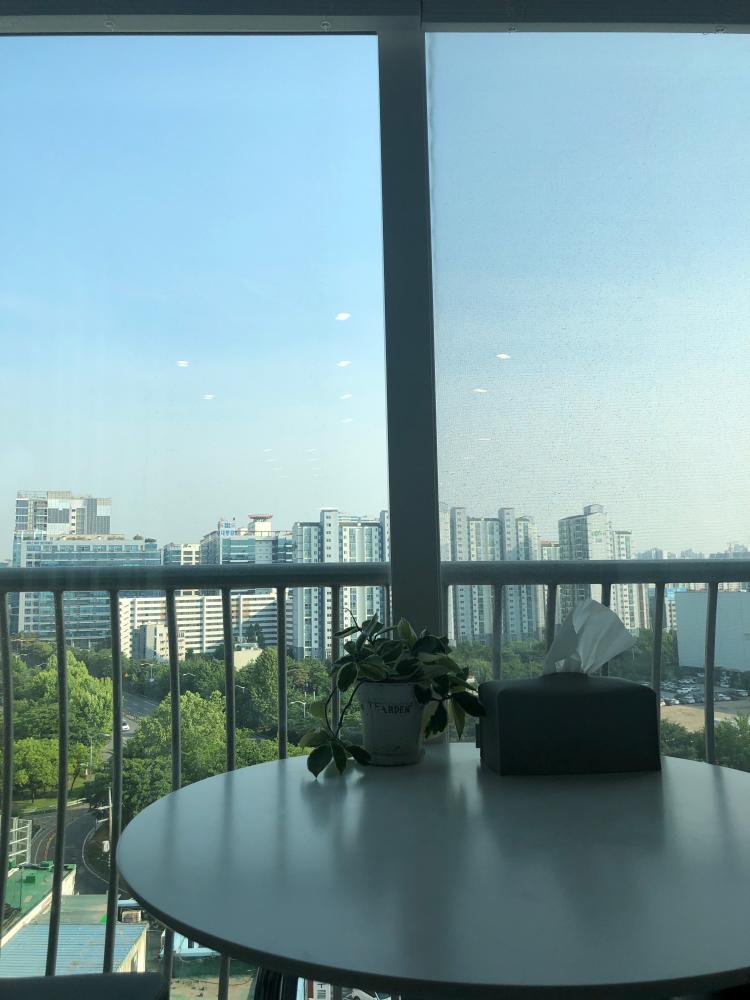 베란다를 확장해서 원형탁자를 놓으니 쉴 때 뷰를 보면서 커피를 마셔요. 날이 좋은 요즘엔 참 좋네요~