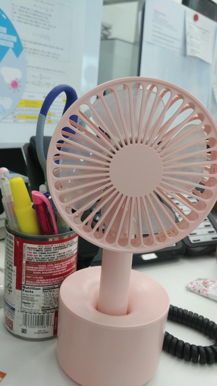 요즘 사무실에서 에어컨 안 틀어줄 때 사용하는 휴대용선풍기에요. 이렇게 크래들에 세우면 일반 선풍기처럼 쓸 수 있어 좋아요^^