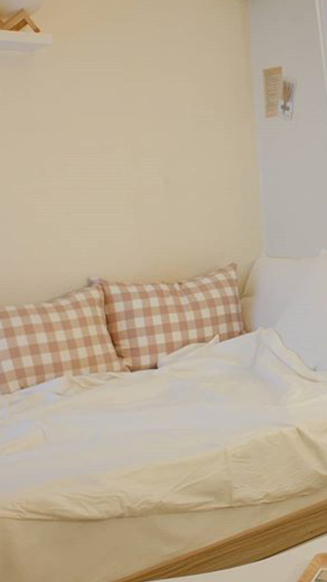 밋밋한 화이트침대에 체크쿠션으로 포인트를 줫어요