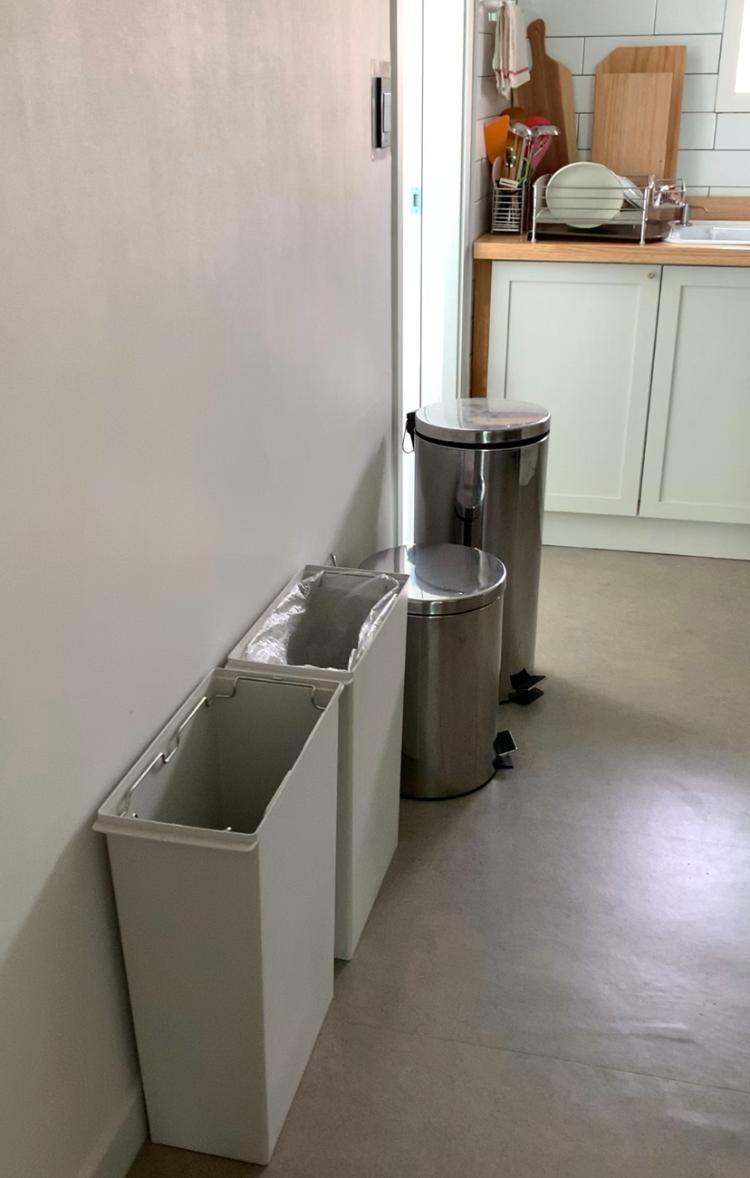주방 분리수거통과 일반쓰레기통이에요. 왼쪽부터 종이,비닐,일반쓰레기,플라스틱 담는 통입니다~