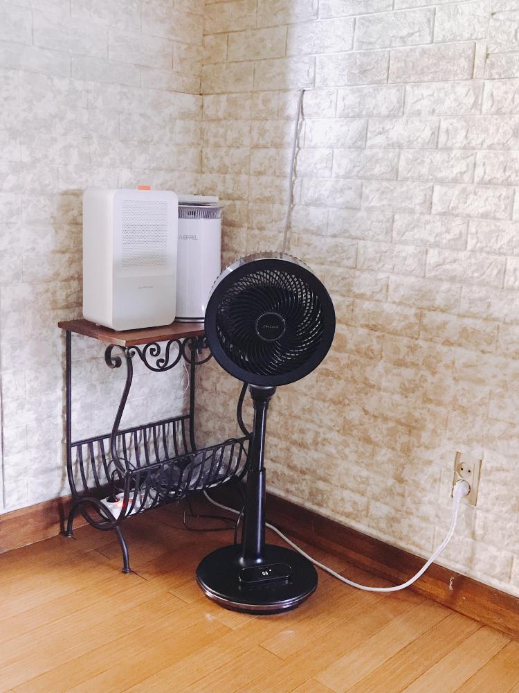 거실 한켠 협탁 위 공기청정기 및 써큘레이터