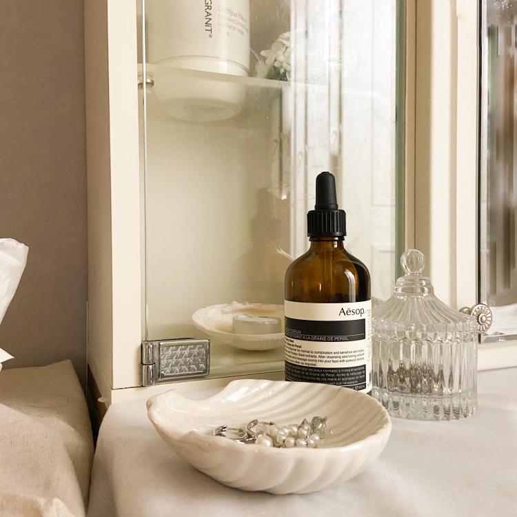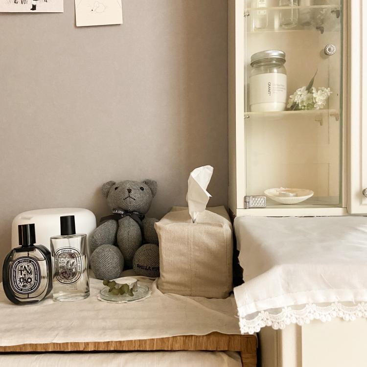 왼쪽 서랍장 위의 소품들. 티슈와 가습기, 자주 쓰는 향수를 올려두었어요.